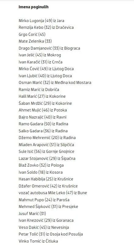 Nesretnih 35 radnika mostarskog Javnog poduzeća Parkovi, starosti od 20 do 50 godina, iza kojih je ostalo više od 80 maloljetne djece, utopilo se, a tom prilikom smrtno je stradao i jedan električar koji je u to vrijeme radio na stupu pored jezera.