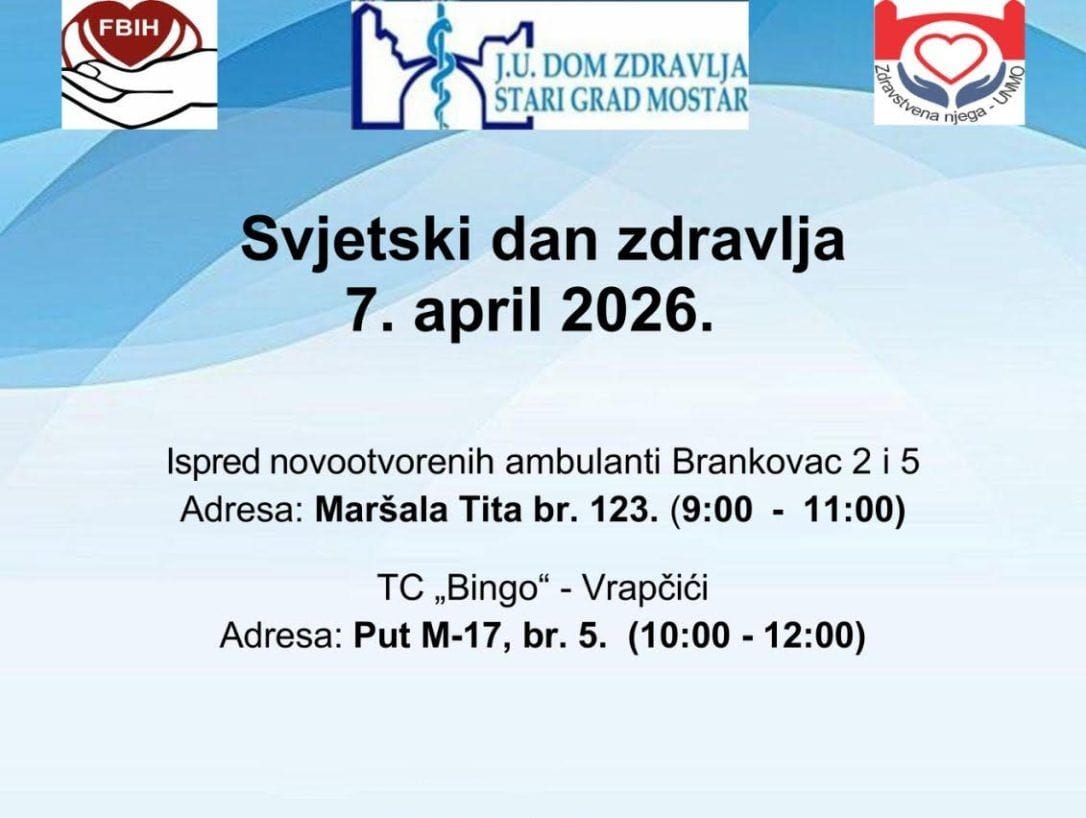 Dom zdravlja Stari grad Mostar zajedno sa studentima Studija Zdravstvena njega Univerziteta “Džemal Bijedić” i Udruženjem med.sestara tehničara FBiH, povodom 7. aprila Svjetskog dana zdravlja, sutra na dvije lokacije organizuje zdravstvenu akciju pod motom “Jedan dolazak može promijeniti sve”.