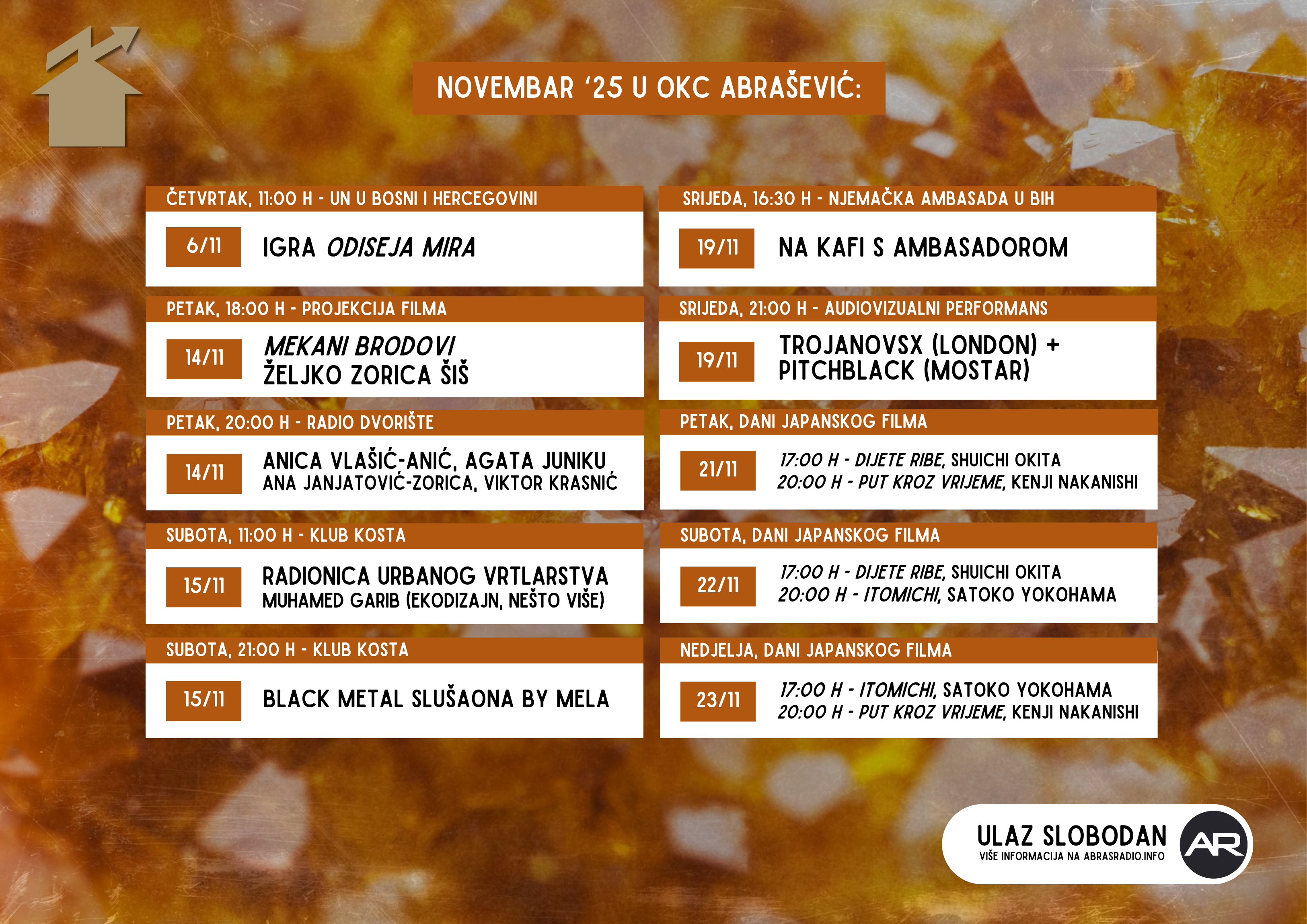 Ulazimo u kratke dane duboke jeseni sa dovoljno topline za svakoga, slijedi najava programskog repertoara za novembar 2025. u Omladinskom kulturnom centru Abrašević.