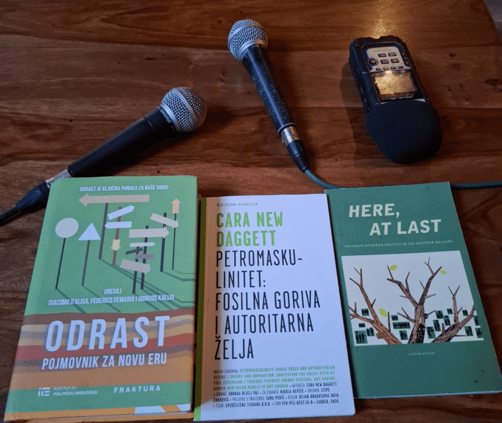 U sklopu Večeri kritičke ekologije Radio dvorišta promišljamo teorije nove paradigme koja uključuje ekološku održivost i društvenu pravdu. Vodili smo se literaturom Biblioteke OKC Abrašević, kao i preporukama voditelja programa, prije svega knjigom Odrast: Pojmovnik za novu eru koju su uredili Giacomoa D’Alise, Federica Demarie i Giorgosa Kallisa. Prisjetili smo se i aktualnih događaja i borbi za očuvanje rijeka, s posebnim naglaskom na stanje oko projekta Gornji horizonti kojeg struka često spominje, ali bez adekvatnog društvenog odgovora. Puštali smo inserte i edukativne video materijale aktivista, teoretičara i eksperata iz Bosne i Hercegovine i regiona, a pogledali smo i kanadski dokumentarni film Antropocen: Ljudska epoha, autorice Jennifer Baichwal, te Nicholasa de Penciera i Edwarda Burtynskog iz 2018. godine.