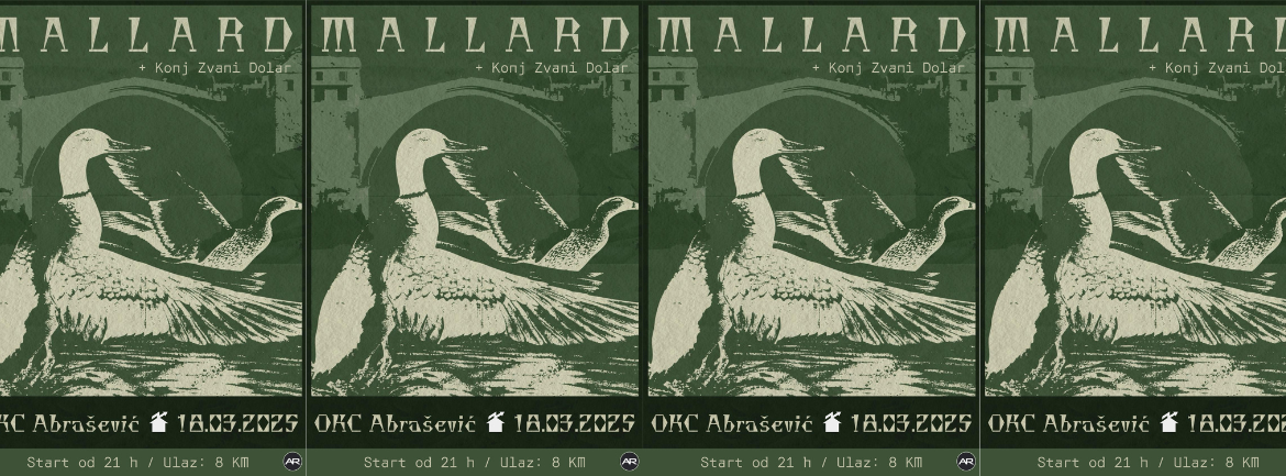 Makedonski label Mrtov konj i kolektiv Gola planina ponovo su u Mostaru. Ovoga puta u goste nam stiže skopski bend Mallard koji pod utjecajem emo i post-hardcore strujanja donosi teme mlade adolescencije. Iza njih su godine zajedničke svirke, a bend vide kao amalgam ukusa i perspektiva svih članova. Svoju muziku opisuju kao intrigantnu i emotivnu.