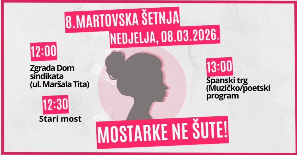 Inicijativa građanki/na Mostara povodom 8. marta – Međunarodnog dana žena, organizuje protestnu šetnju s ciljem skretanja pažnje na položaj žena u Bosni i Hercegovini, na sve učestaliji femicid i nasilje nad ženama, ali i kako bi dostojanstveno obilježili značaj i tekovine samog datuma.