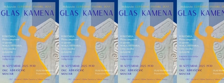 Međunarodni ansambl Buna održat će plesni performans naziva ‘Glas kamena’ u OKC Abrašević 10. septembra. Plesni performans inspiriran je poezijom Mehmedalije Maka Dizdara. Mak Dizdar posuđuje svoj glas stećcima sabirajući u svojim pjesmama mudrost jedne zaboravljene kulture. Njegova poezija vodi nas kroz duboke slojeve postojanja koje teku rijekama, cvjetaju u biljkama, odjekuju pjevom ptica i govore kroz kamen. Kamenje govori riječi koje pokreću cijelog čovjeka i poziva ga na ples koji čini da njegova priča postane neraskidivi dio čitavog svijeta. Euritmijski ansambl ‘Buna’ je međunarodni euritmijski ansambl koji izvodi umjetnost euritmije, odnosno ‘vidljivu muziku’ i ‘vidljivi govor’, gdje se riječi i muzika spajaju kroz gestu i pokret inspiriran antropozofskim principima Rudolfa Steinera. Euritmisti okupljeni za ovaj performans su: Anna Radin (Njemačka), Swenja Reinaerdts (Švicarska), Anna Friedel (Njemačka), Angeline Hofstee (Holandija) i Aylin Bayboga (Italija). Performans će biti popraćen muzikom za violončelo koju potpisuju kompozitori Zoltán Kodály i György Kurtág, dok će za violončelom biti Vladimir Bogdanović.