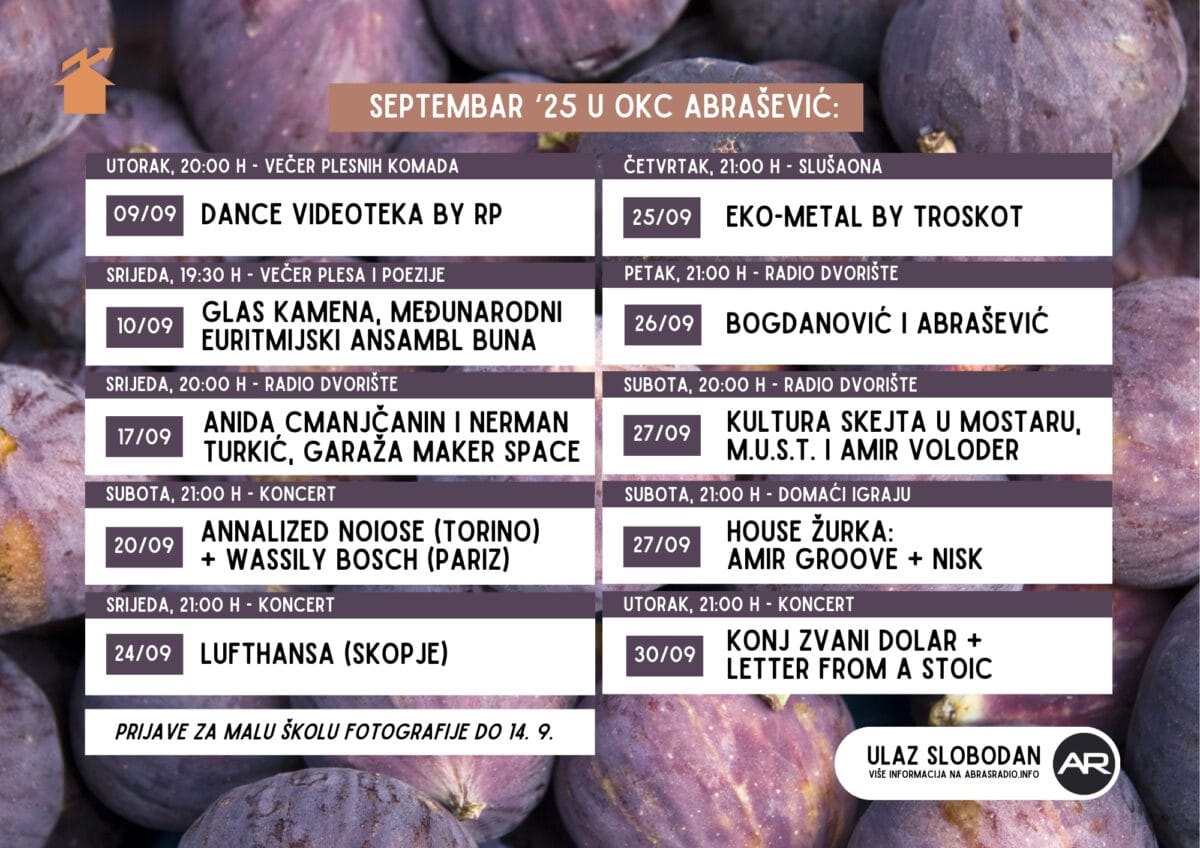 Jesen u Mostaru dočekajte u Abraševiću, jer na repertoaru imamo plesnu videoteku, plesni pjesnički performans, dva javna razgovora, DJ žurku, tri koncerta, zvučni performans i slušaonu. Gosti Abraševića i Kluba Kosta ovaj mjesec su Međunarodni euritmijski ansambl Buna, Anida Cmanjčanin i Nerman Turkić iz mostarskog maker spacea Garaža, talijanski noise duo Annalized_Noiose i moskovsko-pariški eksperimentator Wassily Bosch, makedonska supergrupa Lufthansa, mostarski skejterski kolektiv MUST i njegovi predstavnici Pavle Šuman i Nikola Bevanda, kao i veteran elektronske muzike i skejta Amir Voloder aka DJ Amir Groove, tu su i mostarski sastavi Konj Zvani Dolar i Letter from a Stoic, te Troskot i RP iz Abraševića.