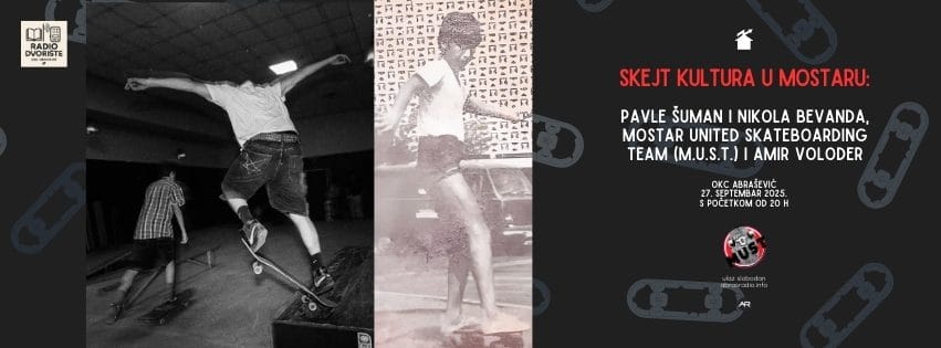 Subota, 27/09 – 20:00 h – Radio dvorište: Kultura skejta u Mostaru – Pavle Šuman i Nikola Bevanda (Mostar United Skateboarding Team) + Amir Voloder (Amir Groove)