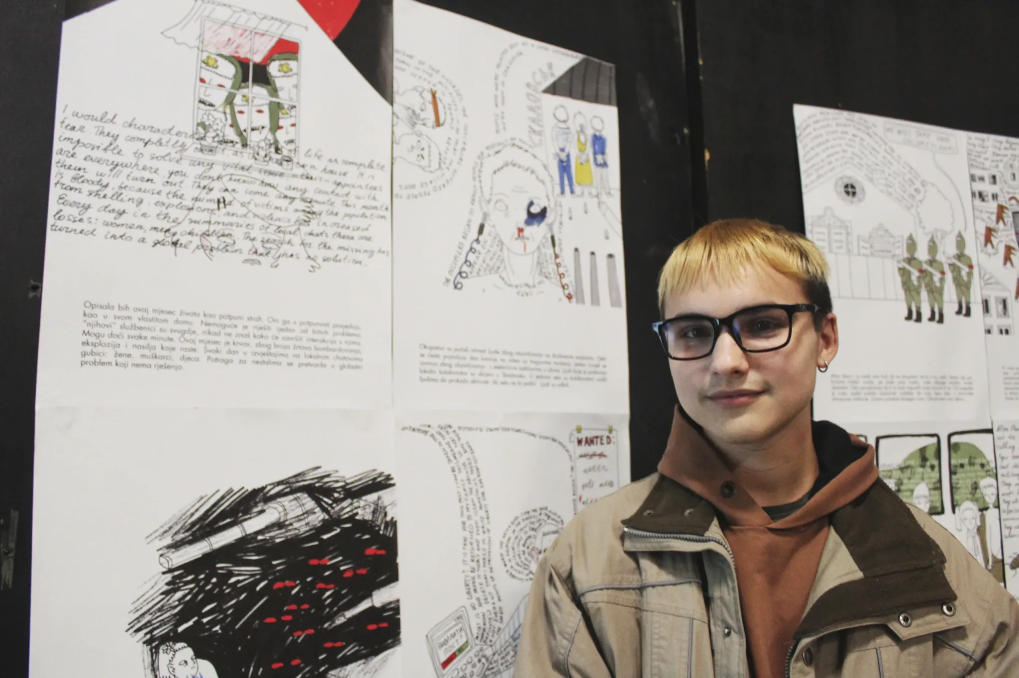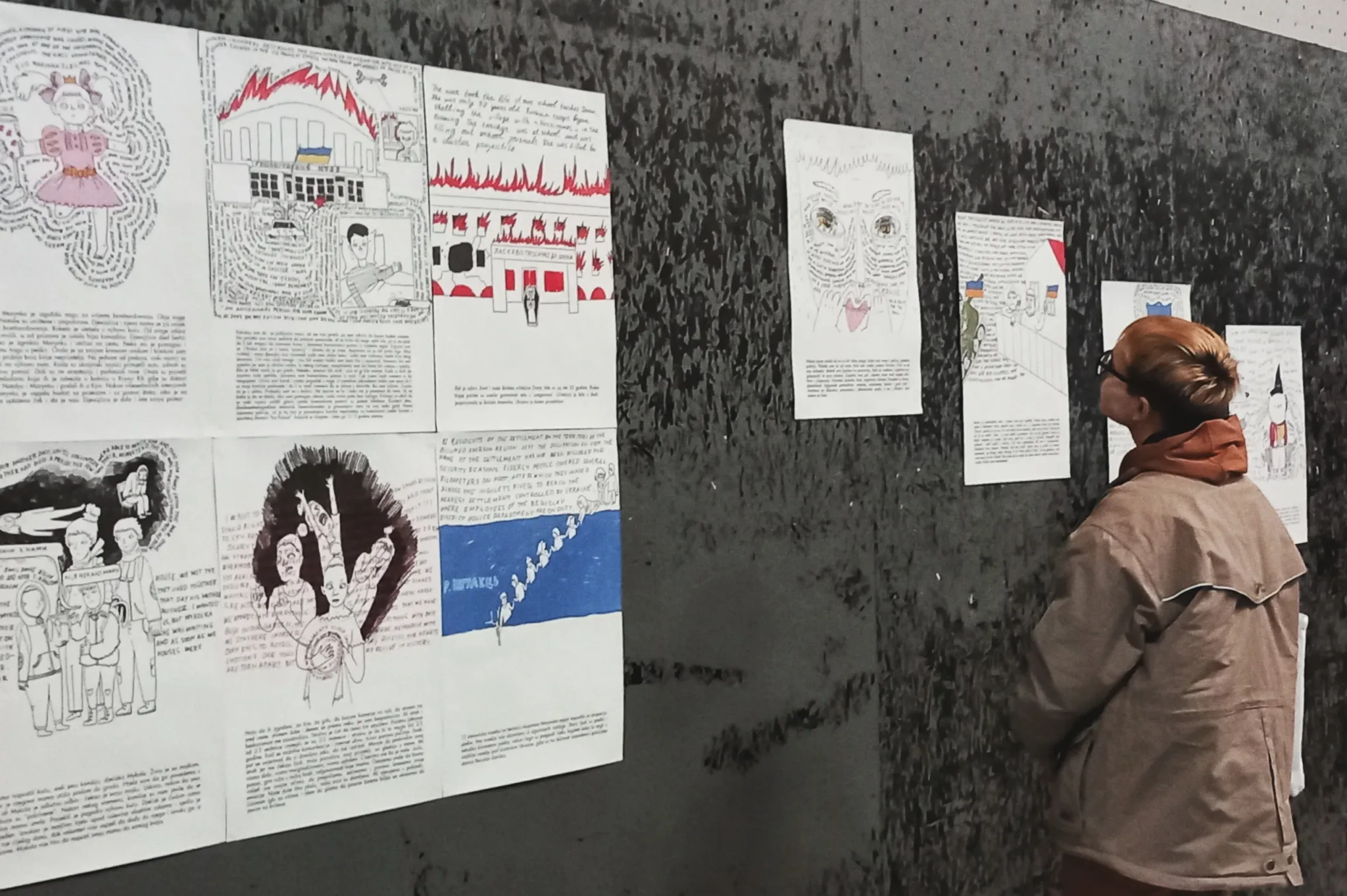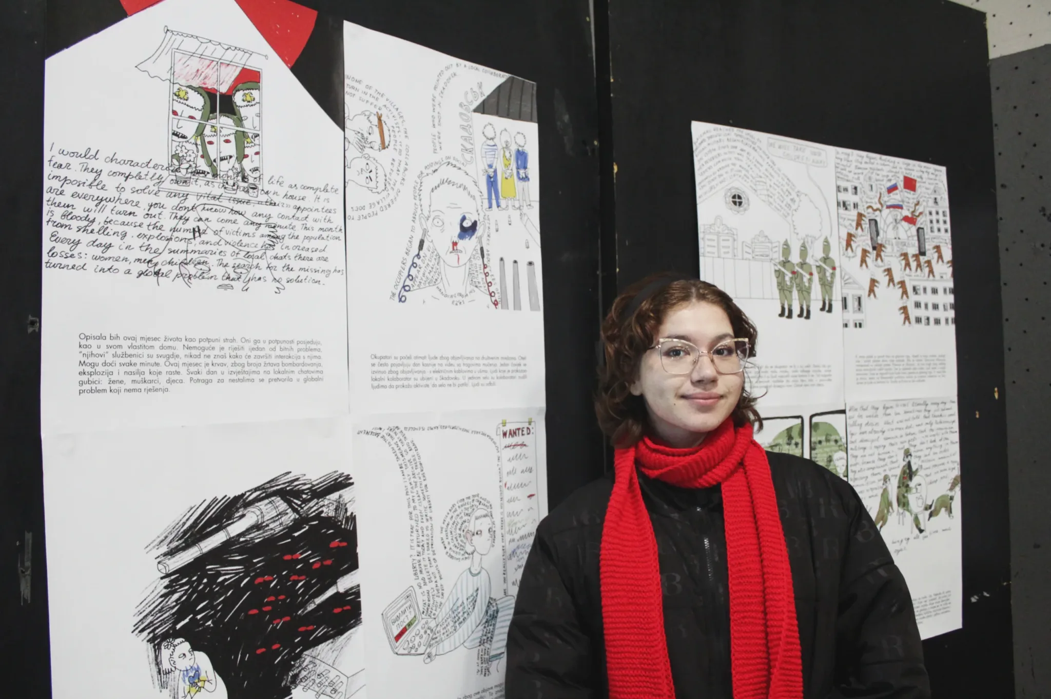 ‘U februaru 2022. bila sam prisiljena napustiti svoj grad, najprije sam otišla za Ivano-Frankivsk, a kasnije u inozemstvo. Nisam mogla nastaviti raditi na svojim projektima istraživanja gradova i arhetipa, ali nisam ni mogla sjediti i ne činiti ništa. Počela sam saradnju s organizacijom STAN. Naš projekt je podržala organizacija Mitost iz Berlina. To je učinilo da se osjećam sigurno u novoj zemlji. U početku mi je Yaroslav Minkin (STAN) slao priče svojih prijatelja. Onda se projektu priključila spisateljica Jana Malyga koja je počela prikupljati priče iz okupirane Khersonske regije, odakle ona dolazi. Moj zadatak je bio kreirati slike prema tim pričama, kako bi se dočarala njihova bit. Crteže sam napravila vrlo jednostavno, kako bi se uravnotežili slika i tekst koji je prati. Jednostavan crtež privlači gledatelja, ali kad priđe bliže, mora pročitati teške priče. Tekst je namjerno napisan da ga je teško čitati, kako bi se izazvala empatija prema pričama na slici.‘, poručila je umjetnica Masha Vyshedska.