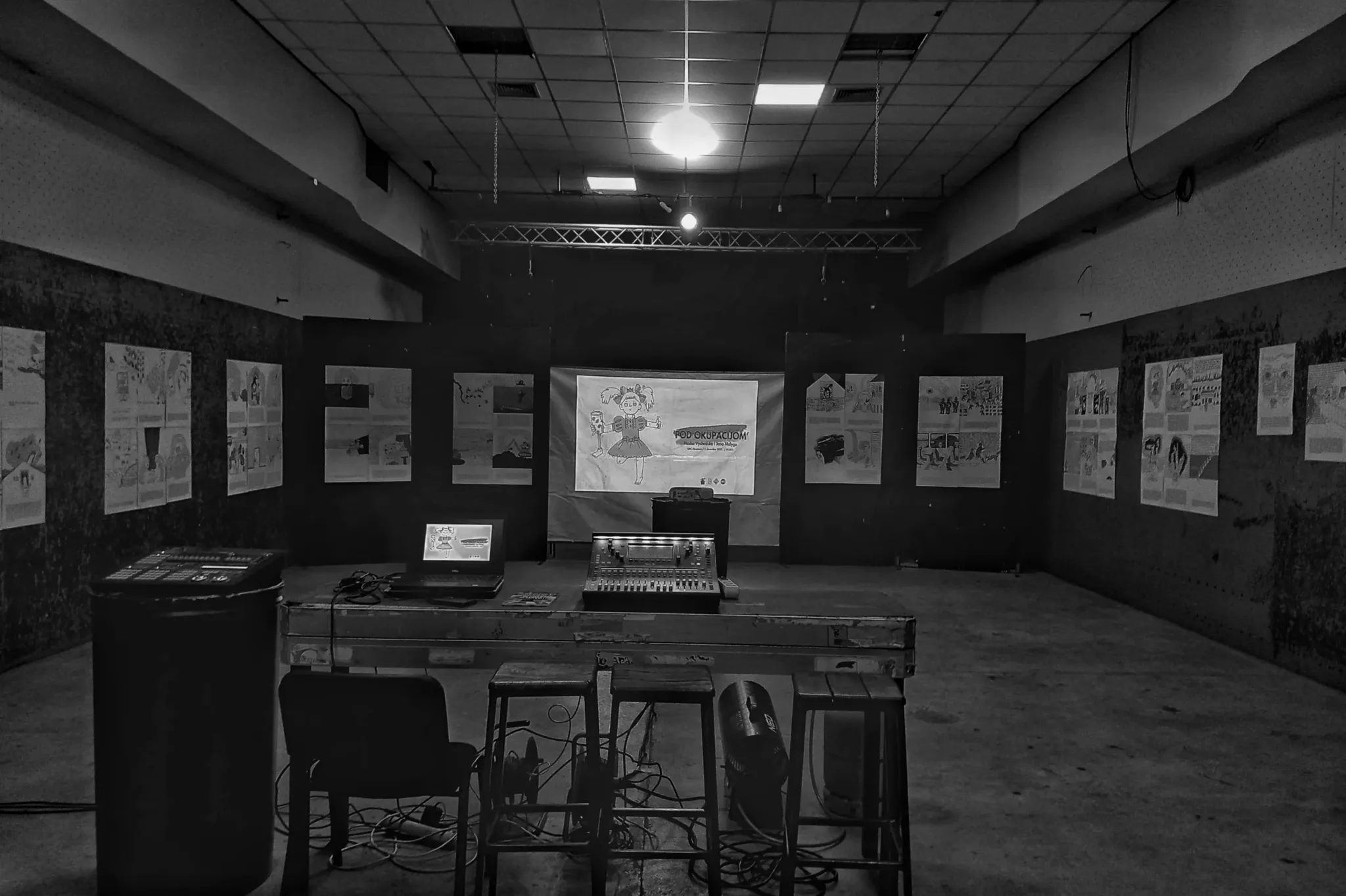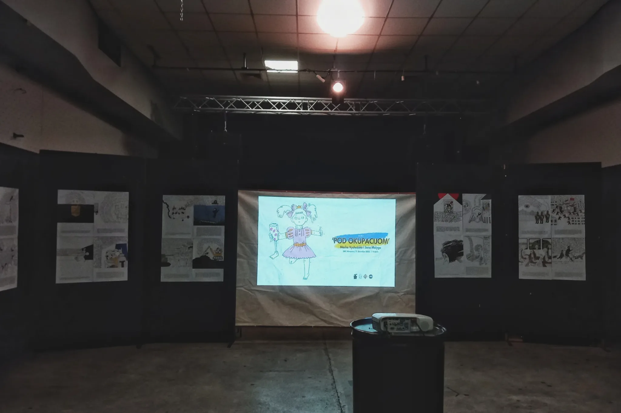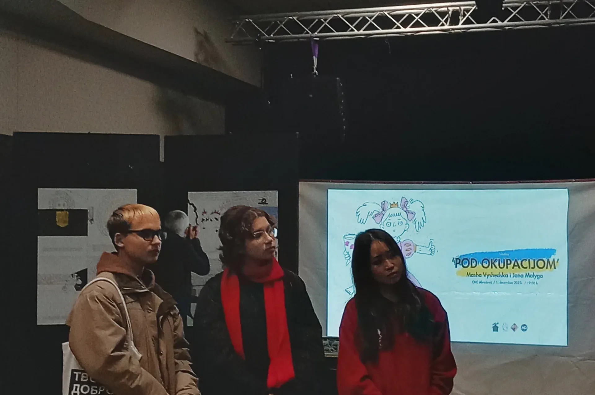 Izložba ‘Pod okupacijom’ proistekla je iz saradnje OKC Abrašević i ukrajinske omladinske organizacije STAN iz Ivano-Frankivska koja okuplja mlade ljude izbjegle iz okupiranih gradova na istoku zemlje te koja je, zajedno s njima, proteklog ljeta obišla Bosnu i Hercegovinu u potrazi za iskustvima života i obnove nakon rata i agresije. Zajednička iskustva naših zemalja i društava prilikom posjete OKC Abrašević nisu ostala neprimijećena, pa se iz ovog razumijevanja rodila želja za daljnjom saradnjom. Umjetnice, i same prognane iz svojih gradova, mostarskoj publici su se na otvaranju izložbe javile videoporukama.